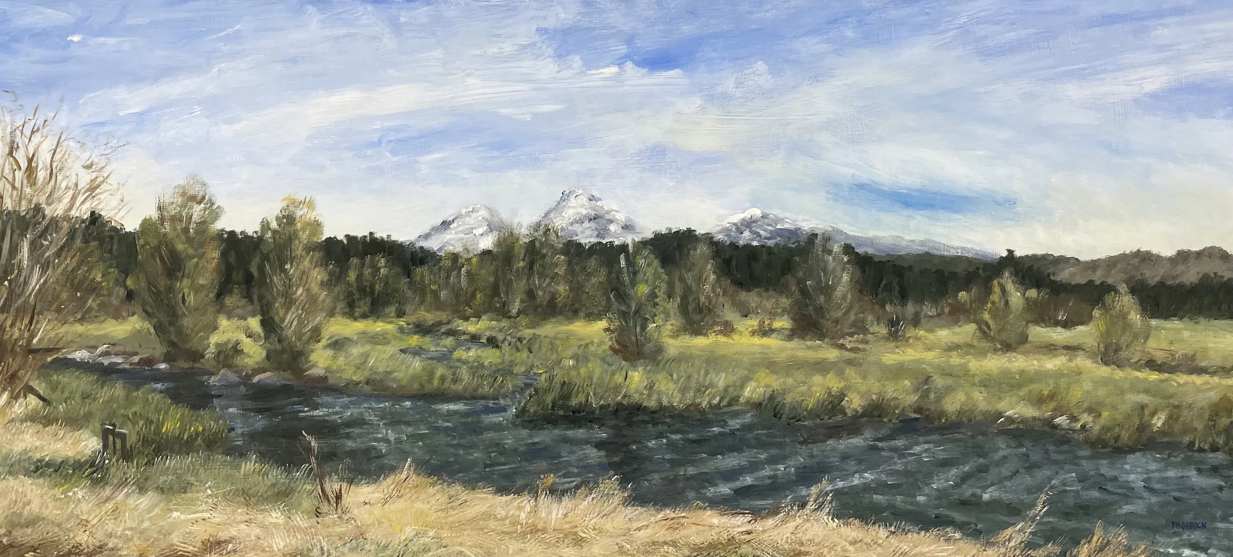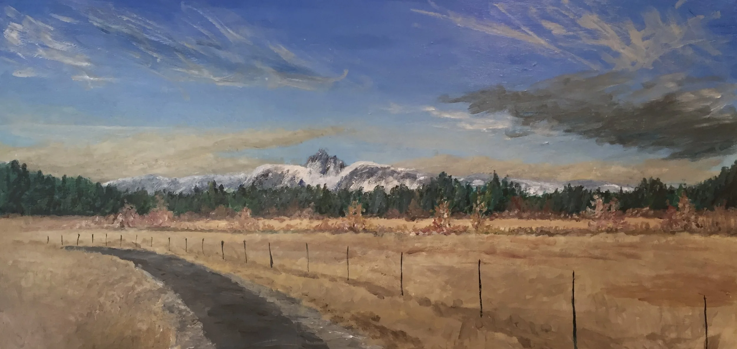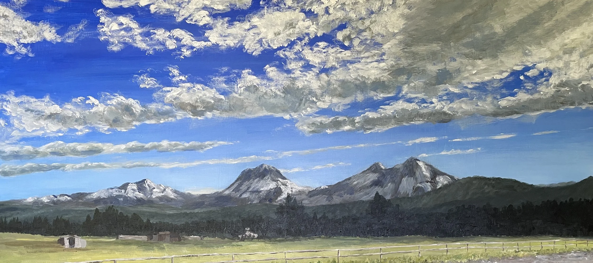 Two Sisters and Belknap Crater from the meadow | 16x36” Acrylic on board | May 2022 | Unavailable